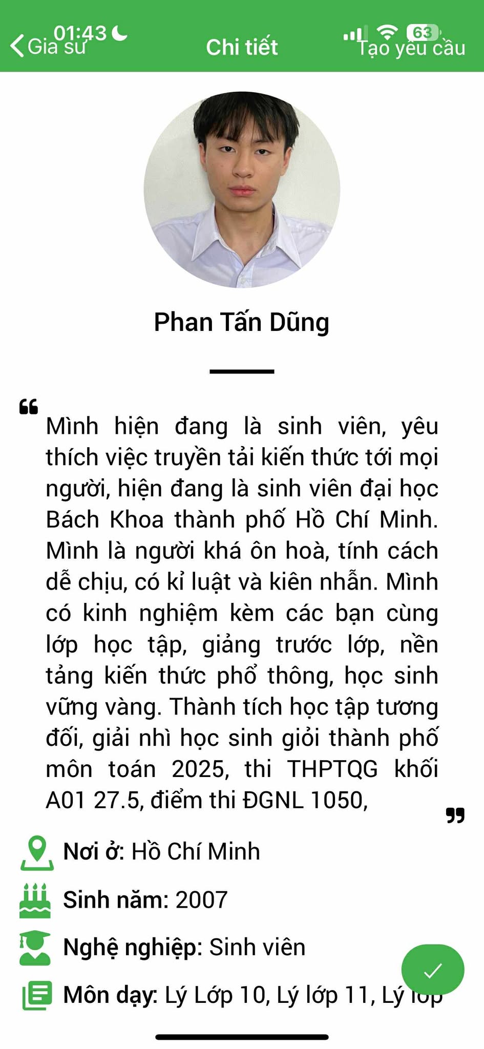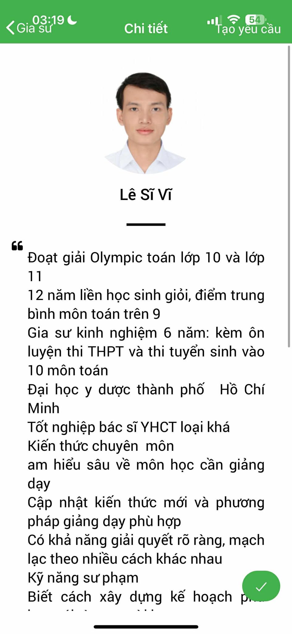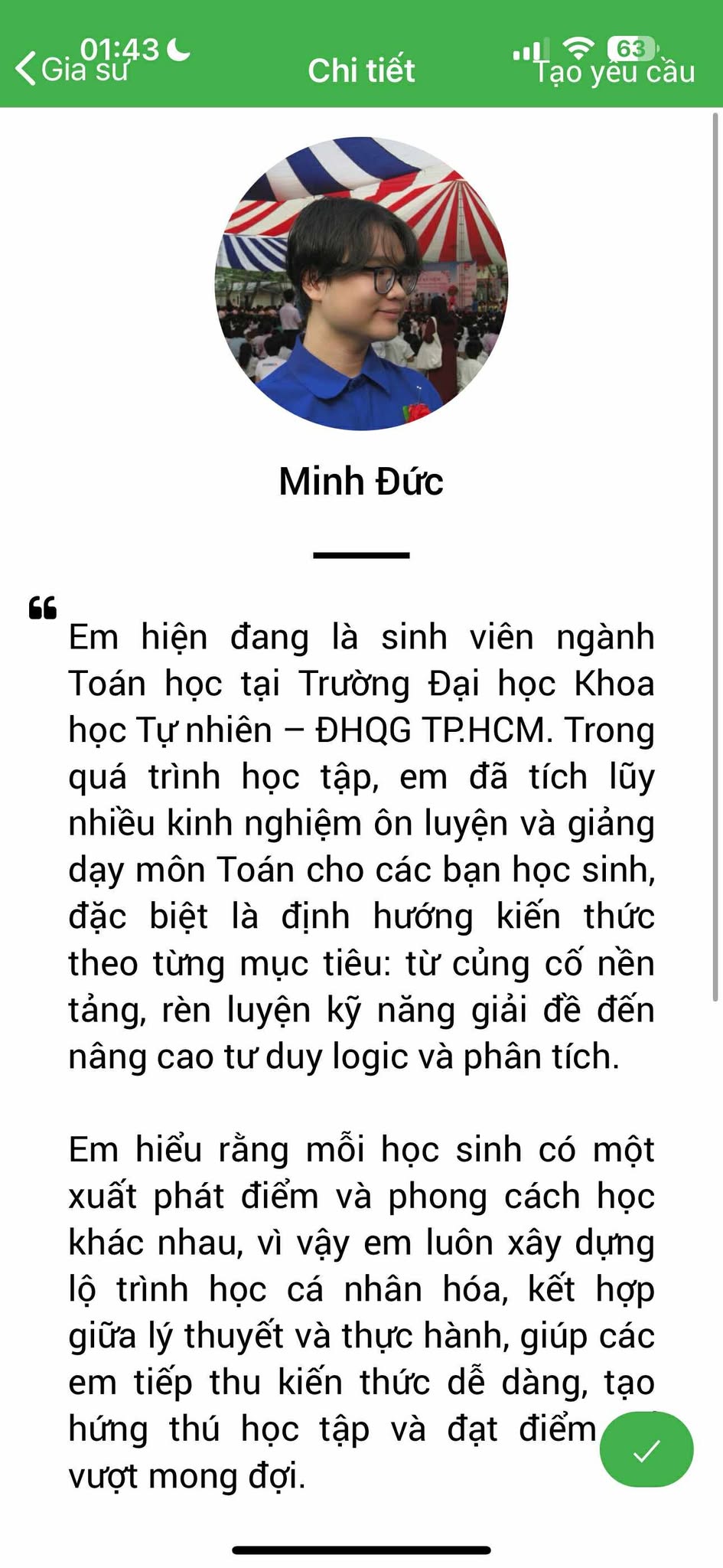 Bằng những thao tác đơn giản và thuận tiện, các học viên sẽ tìm cho mình gia sư phù hợp bằng nhiều tiêu chí khác nhau, dễ dàng tra cứu thông tin gia sư và nội dung lớp học; đồng thời có thể gửi yêu cầu học thử 02 buổi với gia sư mà mình chọn, nếu không phù hợp thì học viên sẽ được tư vấn kỹ hơn và tiếp tục chọn gia sư đến khi nào phù hợp mới thôi.