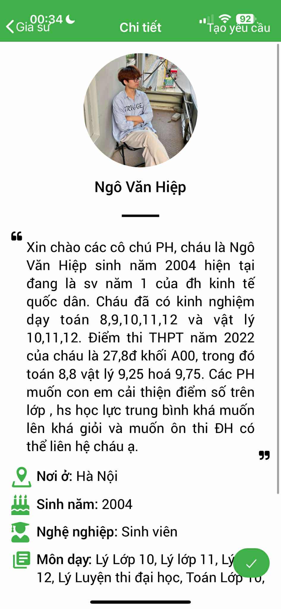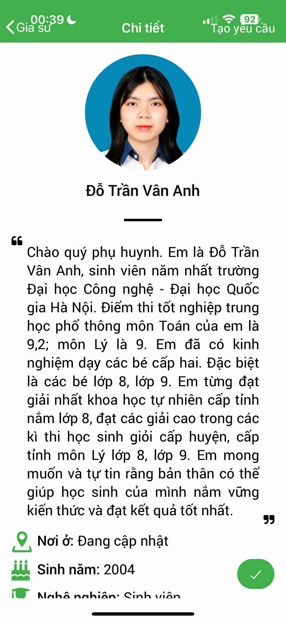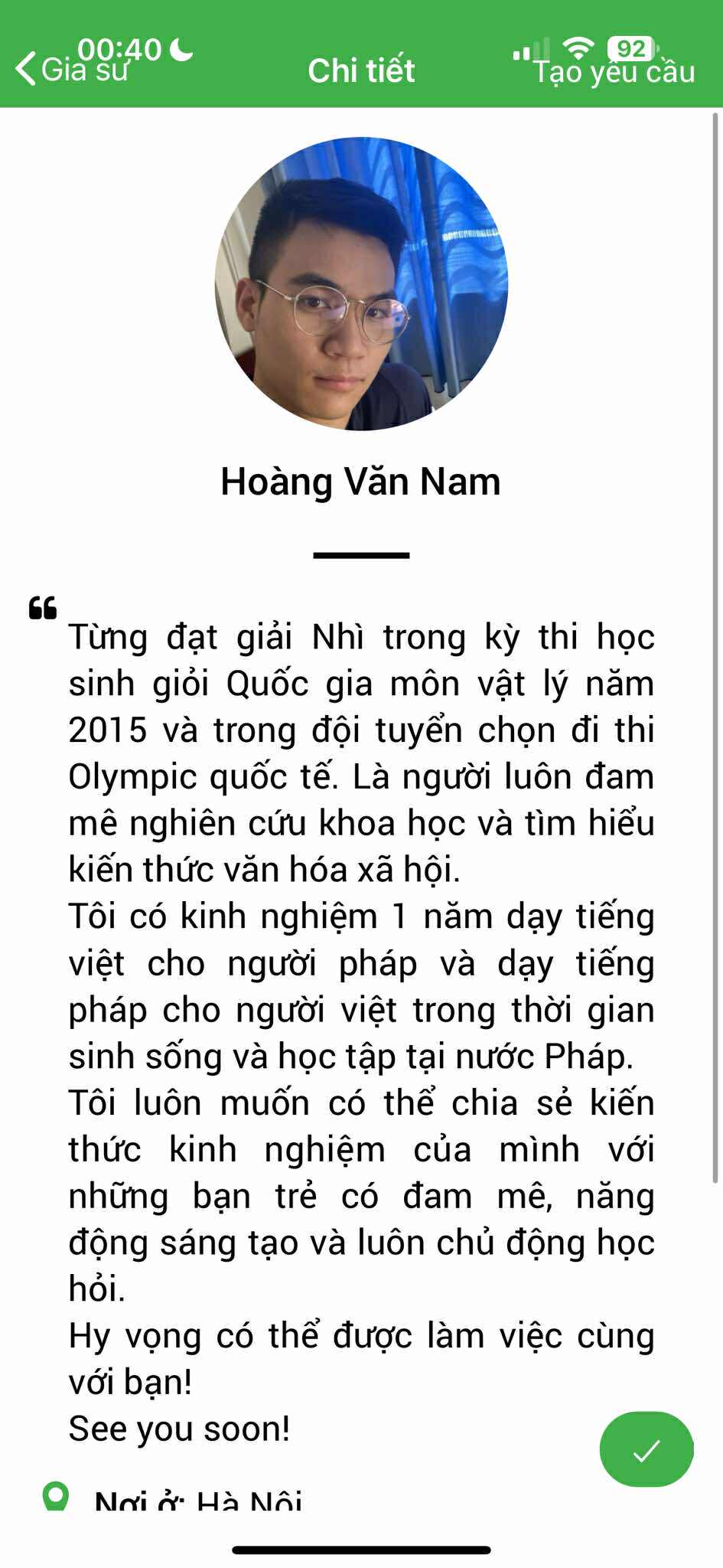 Mình đã làm việc với Daykemtainha.vn từ thời là sinh viên giờ mình đã là giáo viên đang đứng lớp, Mình từng nhận lớp tại trung tâm rất nhiều lớp, trung tâm làm việc chuyên nghiệp, rõ ràng, mình có thể nhận lớp qua chuyển khoản nên rất tiện, lớp bị hủy cũng đều được trung tâm chuyển khoản lại, mình thất rất okie.