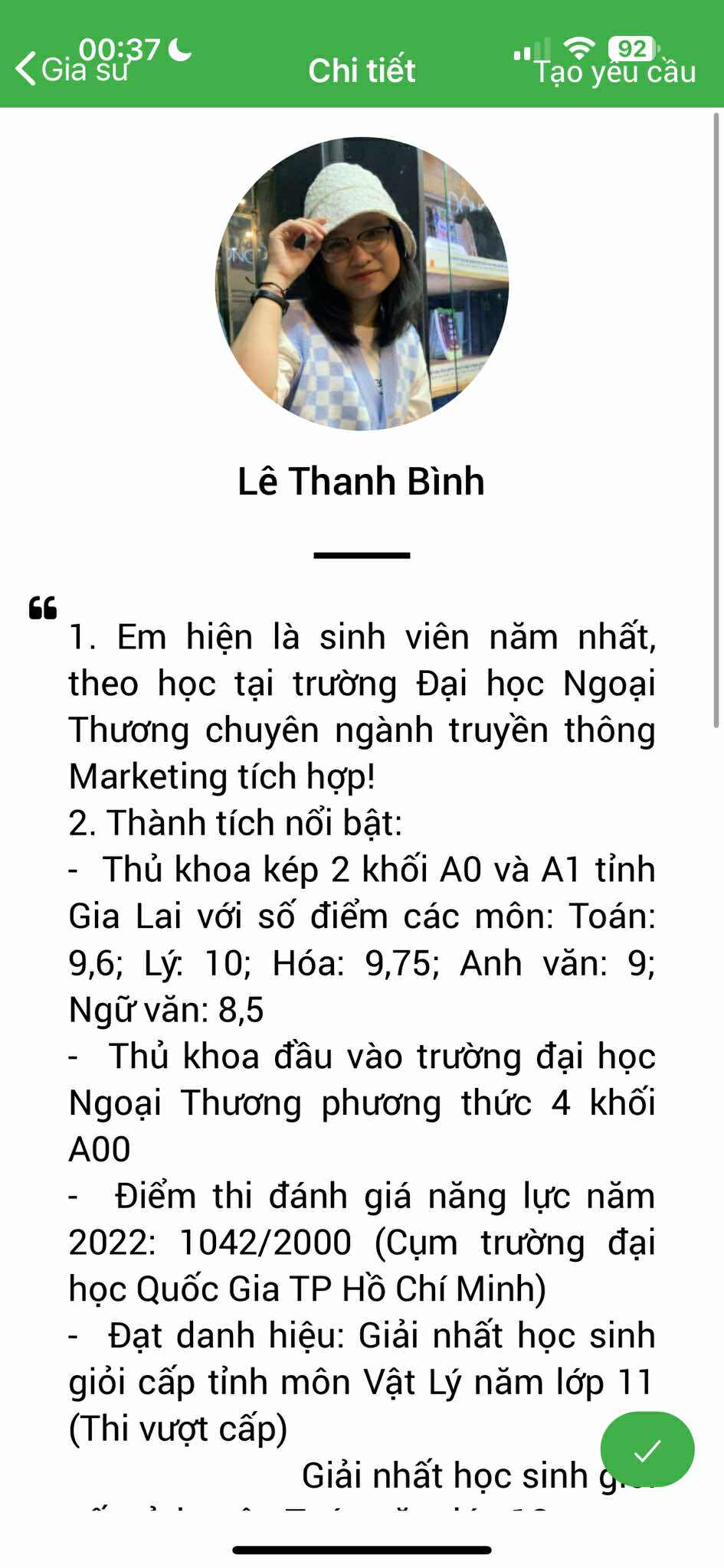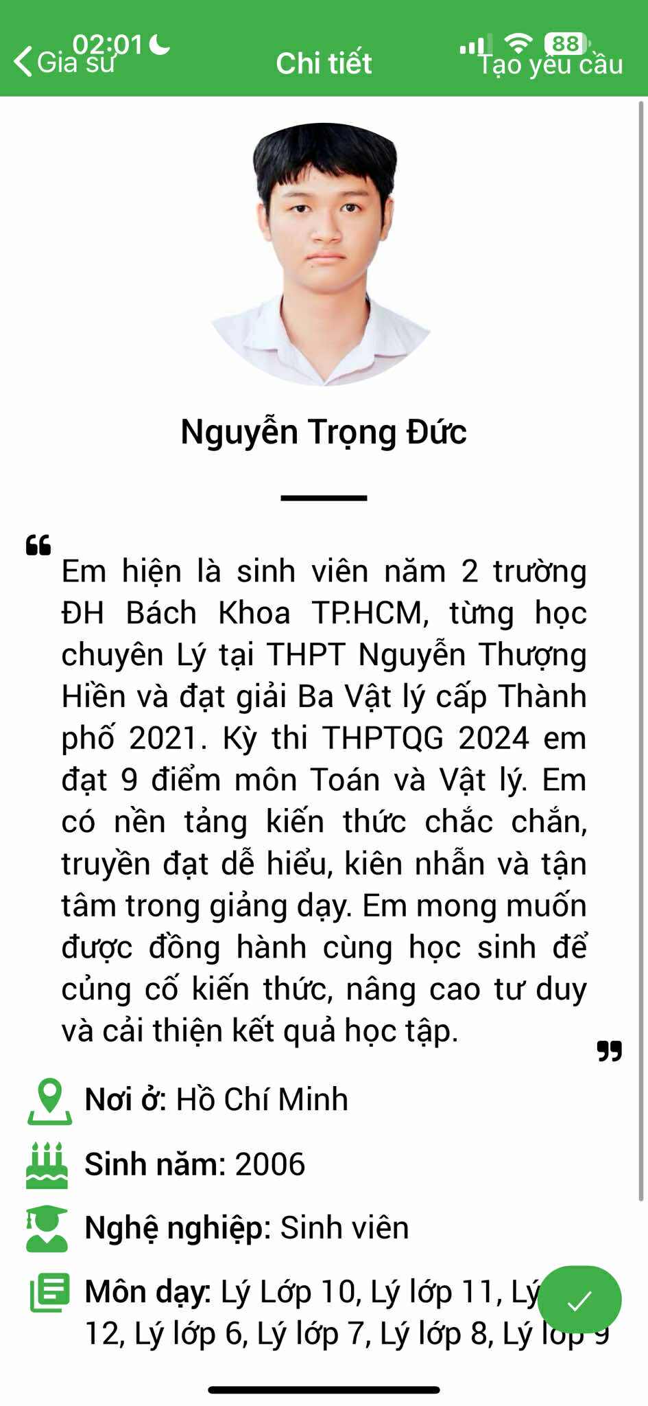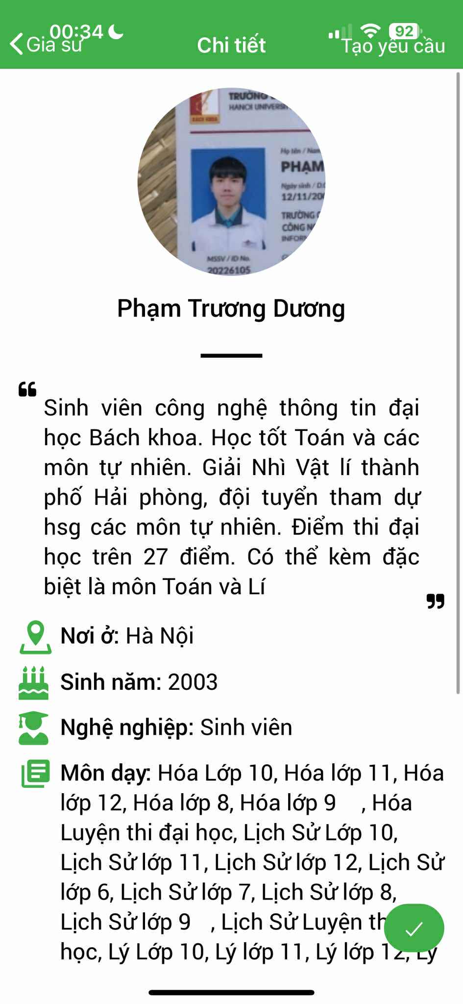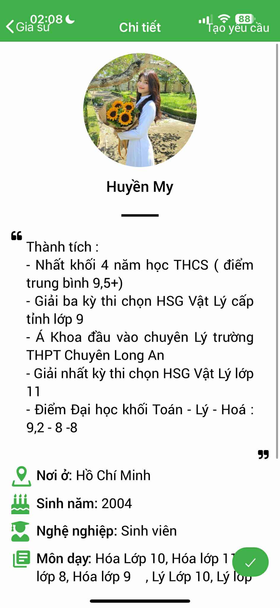 Mình đã làm việc với Daykemtainha.vn từ thời là sinh viên giờ mình đã là giáo viên đang đứng lớp, Mình từng nhận lớp tại trung tâm rất nhiều lớp, trung tâm làm việc chuyên nghiệp, rõ ràng, mình có thể nhận lớp qua chuyển khoản nên rất tiện, lớp bị hủy cũng đều được trung tâm chuyển khoản lại, mình thất rất okie.