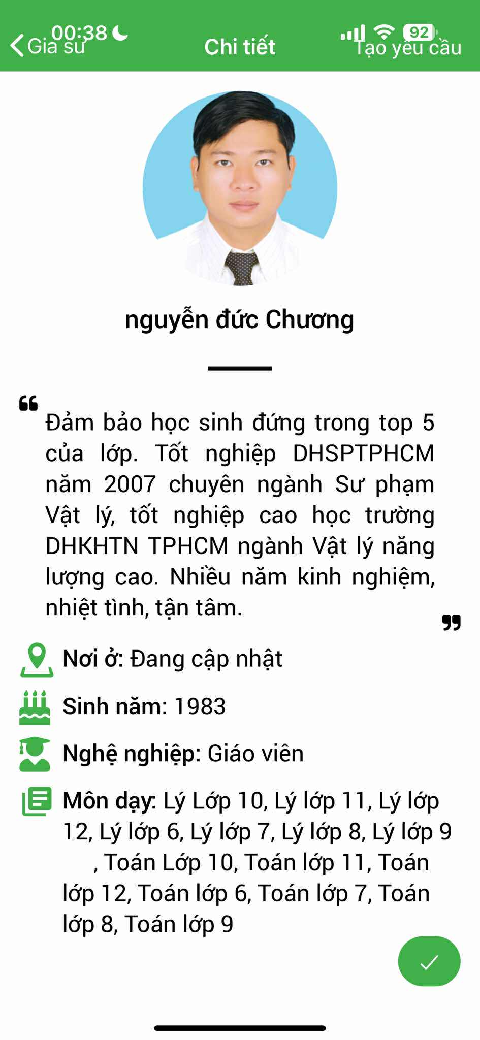 Mình là Nhàn gvien dạy guitar, mình thường xuyên nhận lớp tại ứng dụng daykemtainha.vn, do mình dạy nhiều nên không có thời gian qua trung tâm, mình chỉ qua 2 lần tại quận 8 phạm thế hiển còn những lần sau đa số mình nhận lớp qua chuyển khoản, nhận lớp tiện lợi, lớp có trục trặc từ phụ huynh mình đều được chị My chuyển khoản lại. mình nhận lớp ở đây rất an tâm.